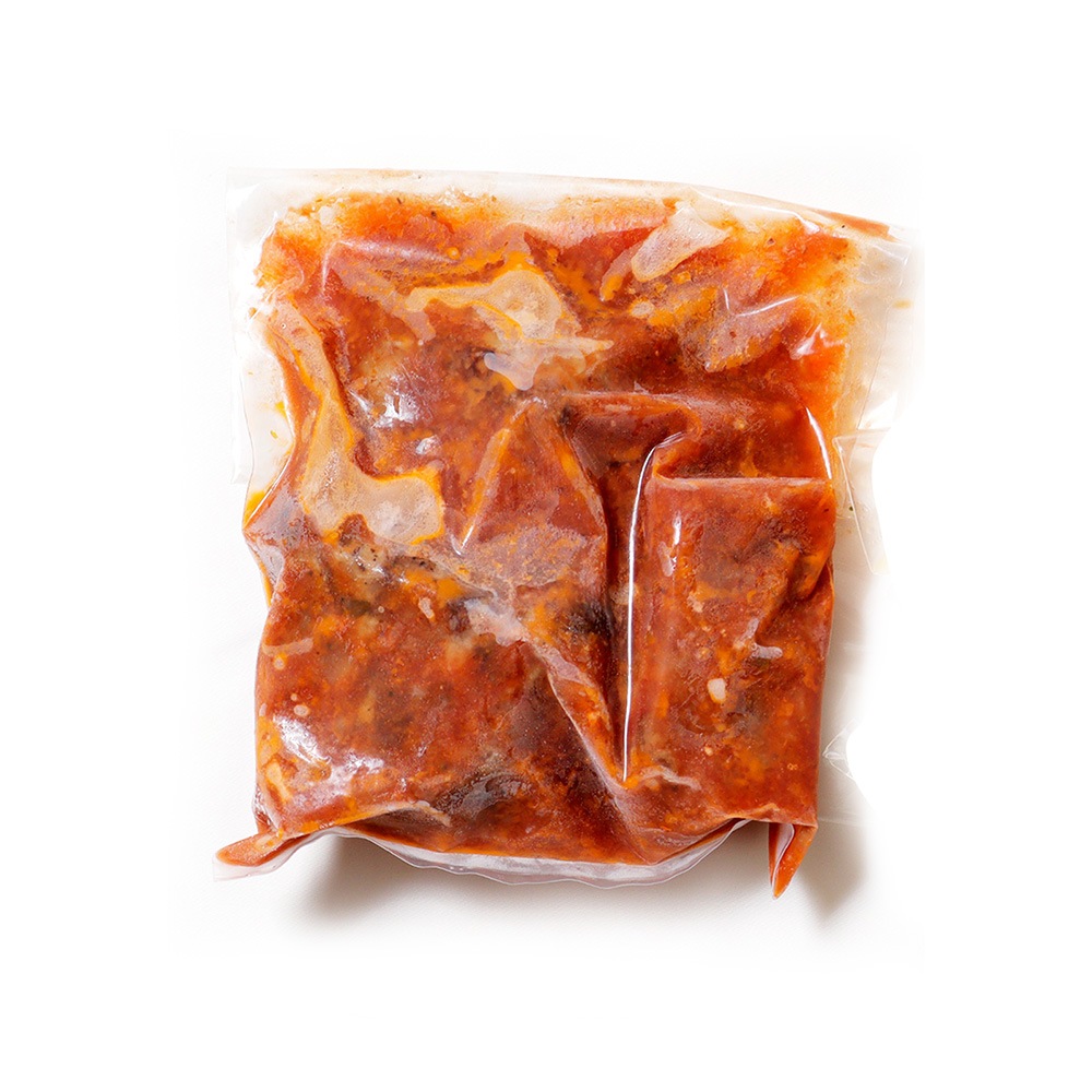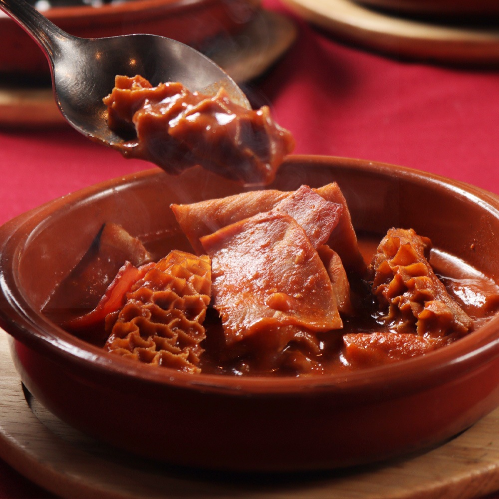 創業当時の総調理長がマドリードにある世界最古のレストランを視察し、その店で食べた牛ミノの煮込みの味に感銘を受けました。それを日本で再現しようと考案したレシピを、今日まで引き継ぎ続けています。具には臭みの少ないミノとハチノスを使用。さらに臭みを消すため香味野菜と一緒に煮込んで丁寧に水洗いする工程を2回行い、最新圧力調理器で抜群の歯応えになるよう仕上げました。たっぷりの野菜にスパイス、ベーコンやイベリコ豚のチョリソーも入っています。旨味の中にほんのり辛みもあるソースは、牛ミノと相性抜群。